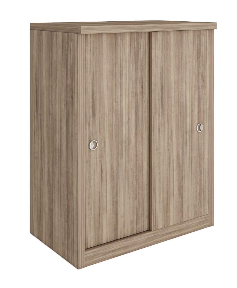 A space-saving cabinet with sliding doors, offering convenient storage access in compact office settings..