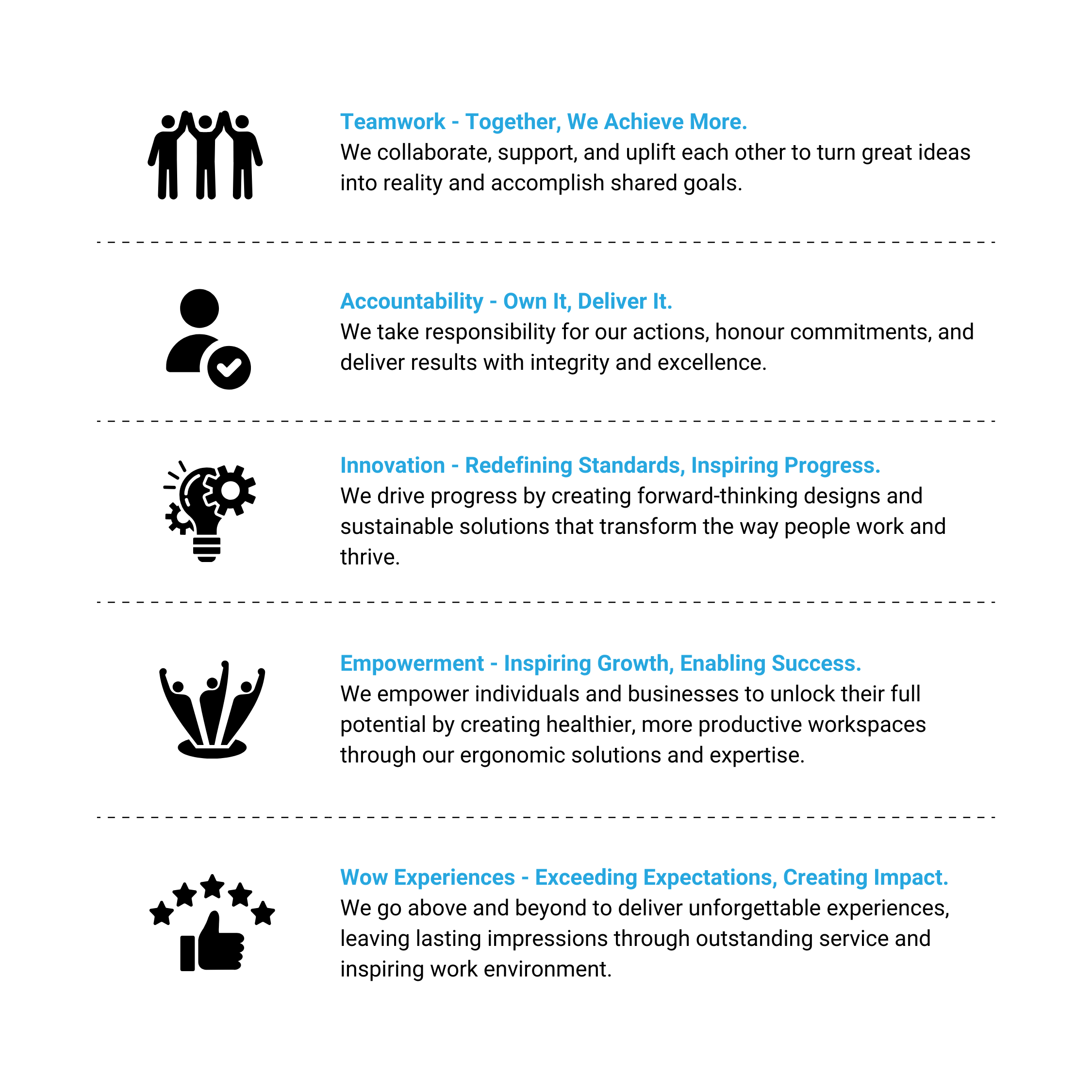 To inspire healthier, more productive lives by transforming workspaces with ergonomic office furniture solutions that empower growth, well-being, and meaningful connections.