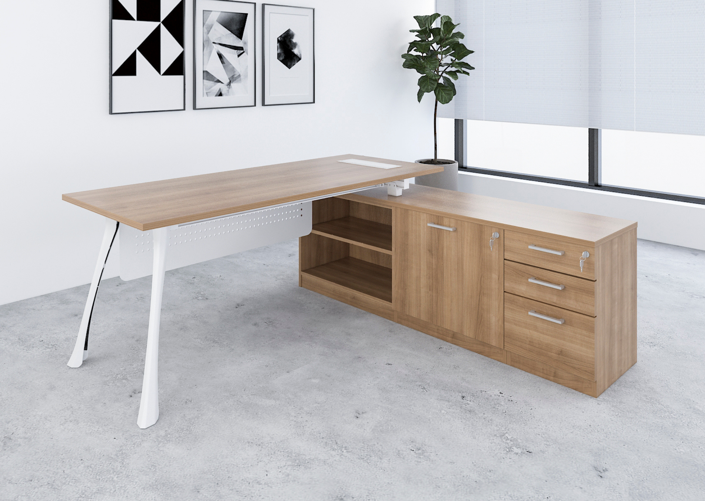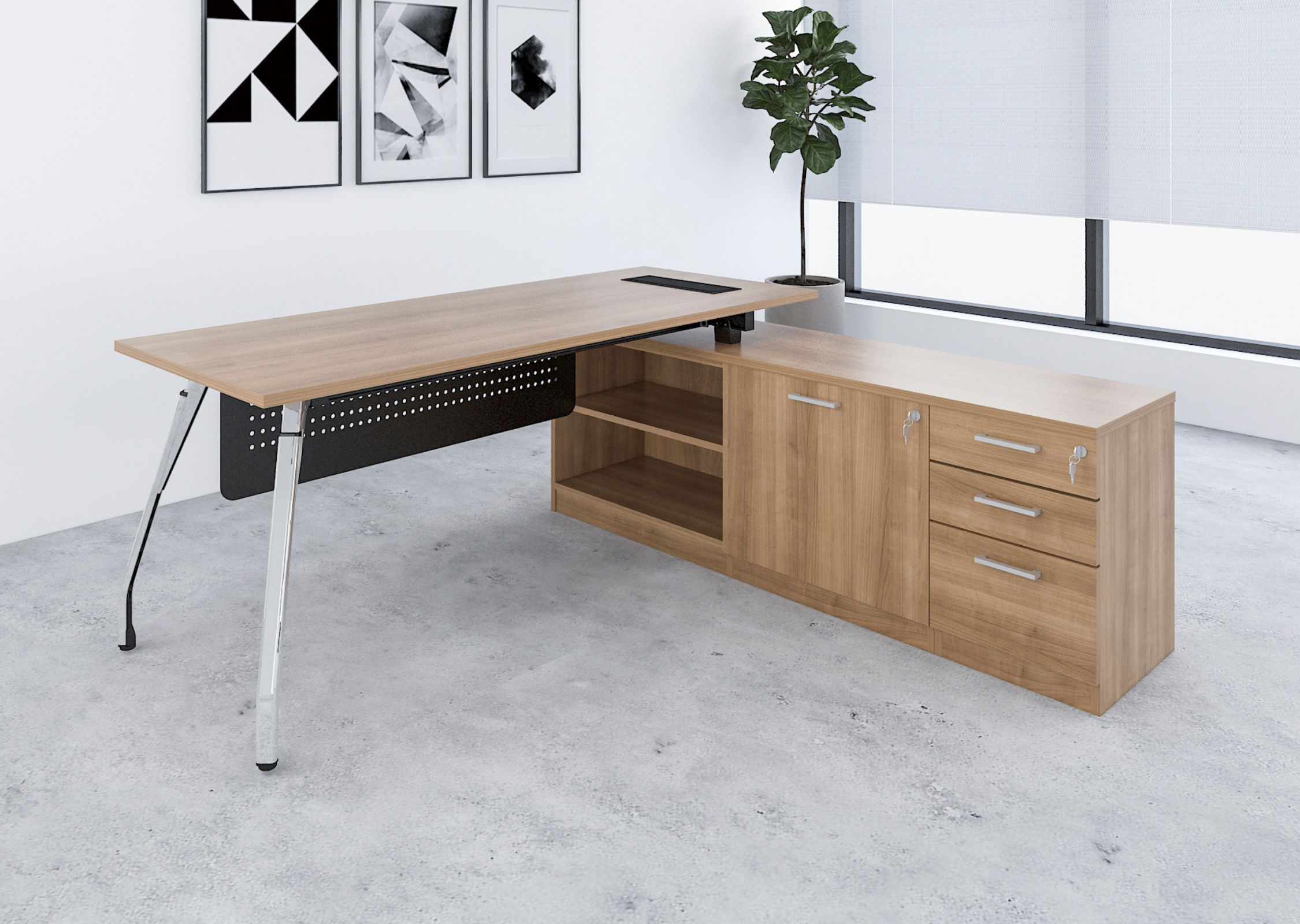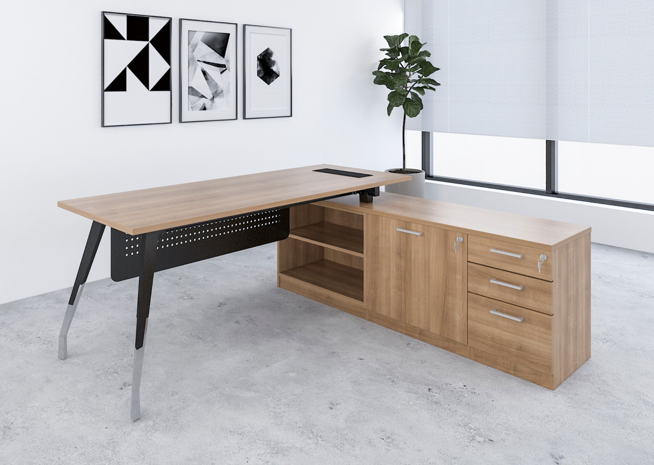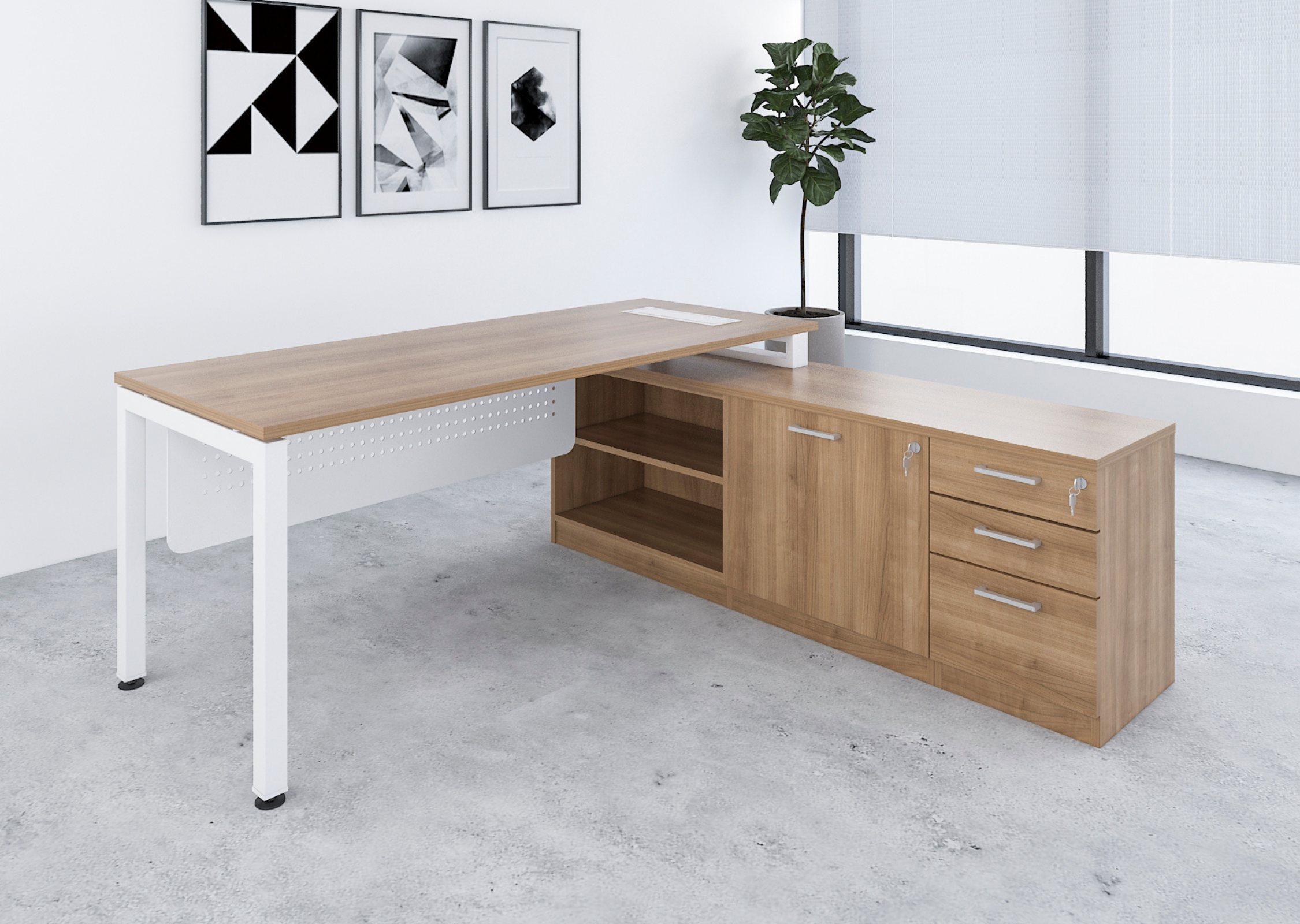 A functional manager desk with an integrated pedestal for secure storage of important files and office supplies, keeping the workspace neat and organized.