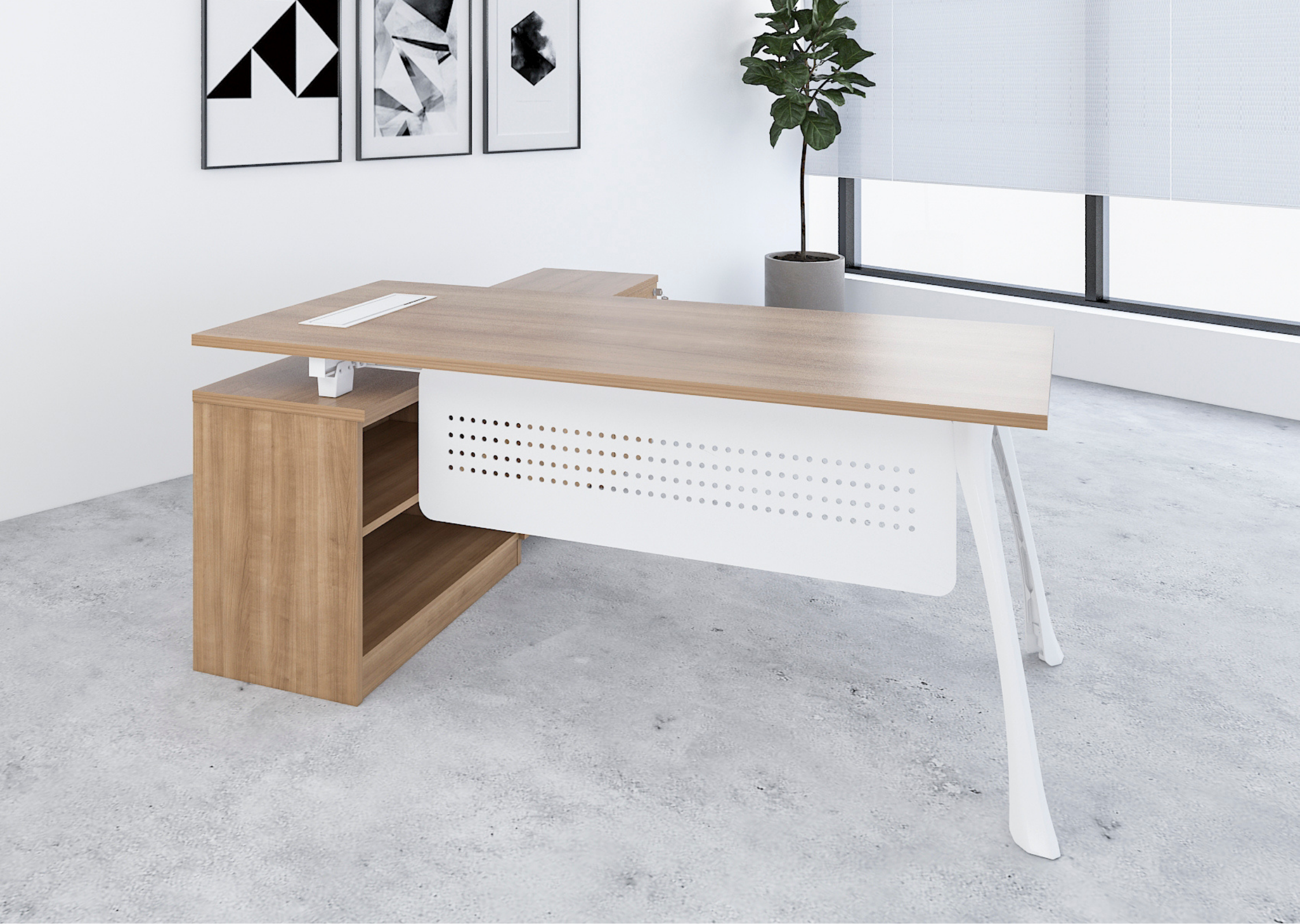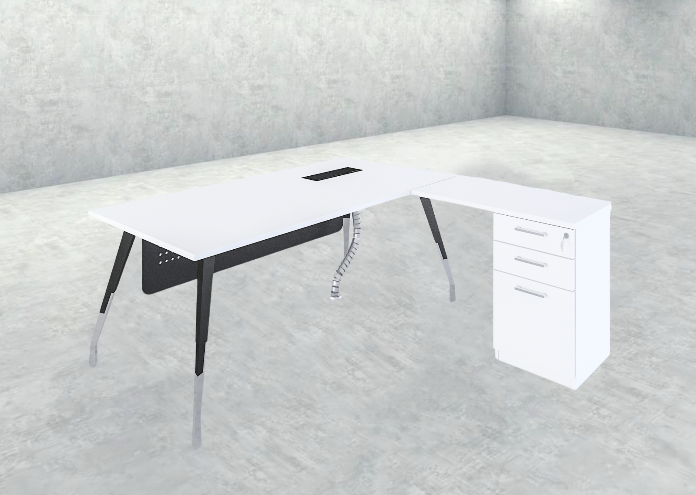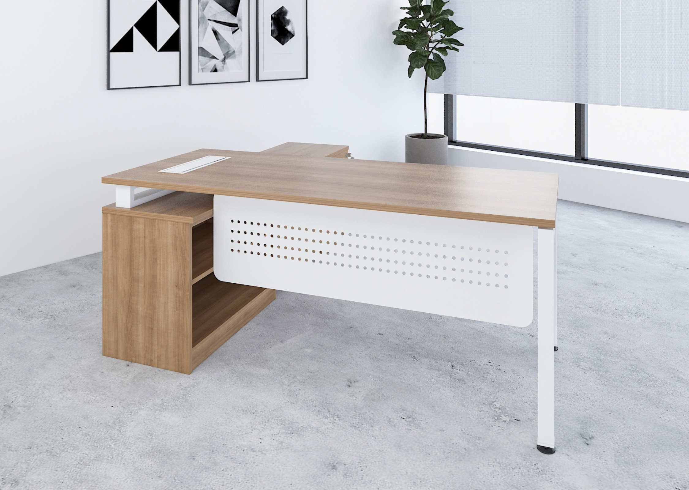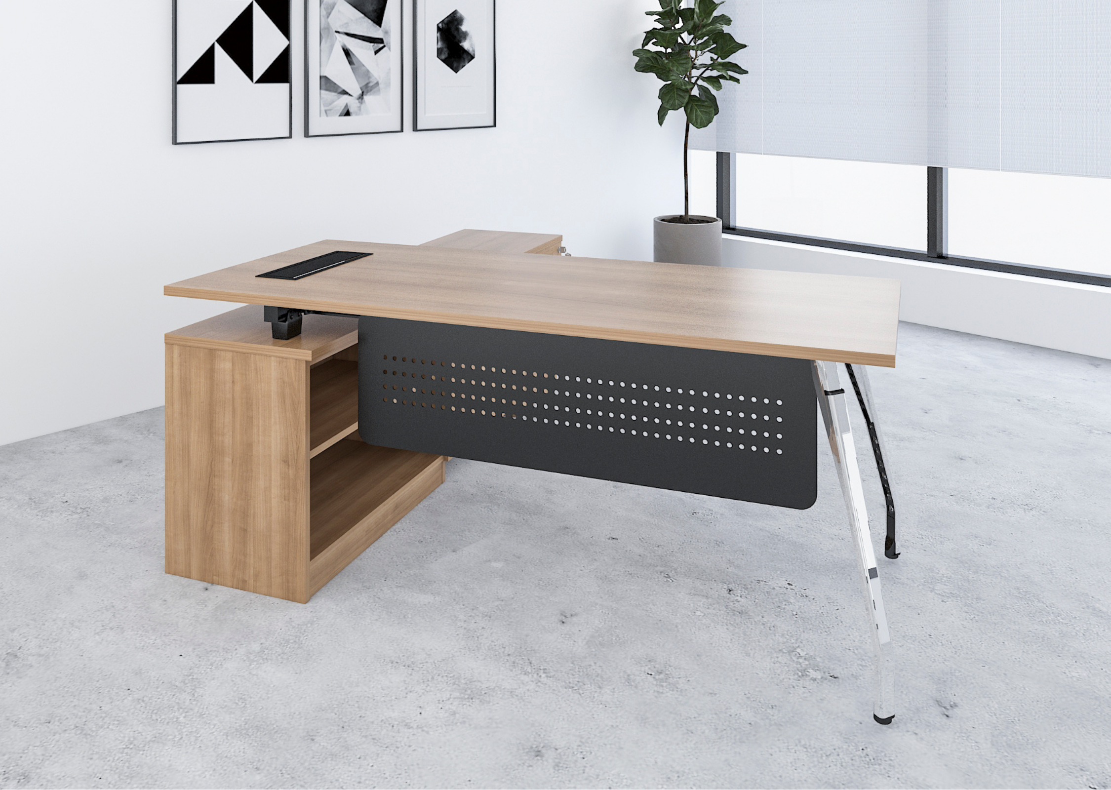 A functional manager desk with an integrated pedestal for secure storage of important files and office supplies, keeping the workspace neat and organized.