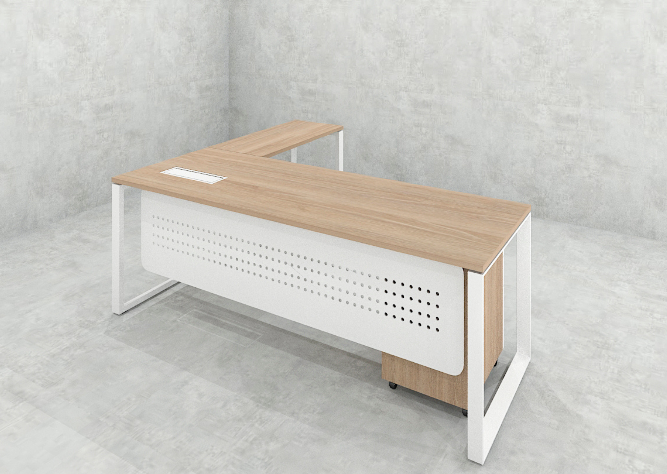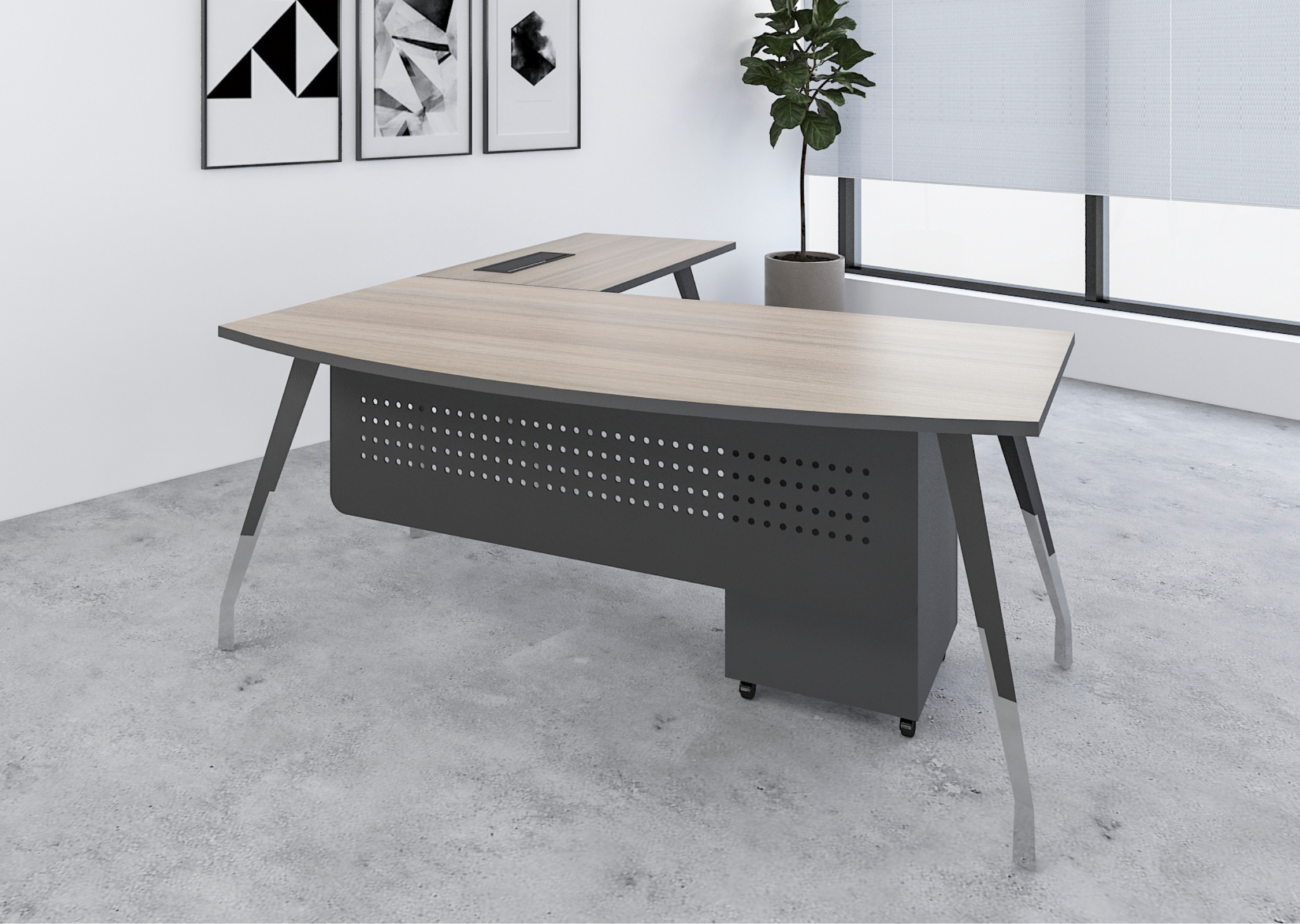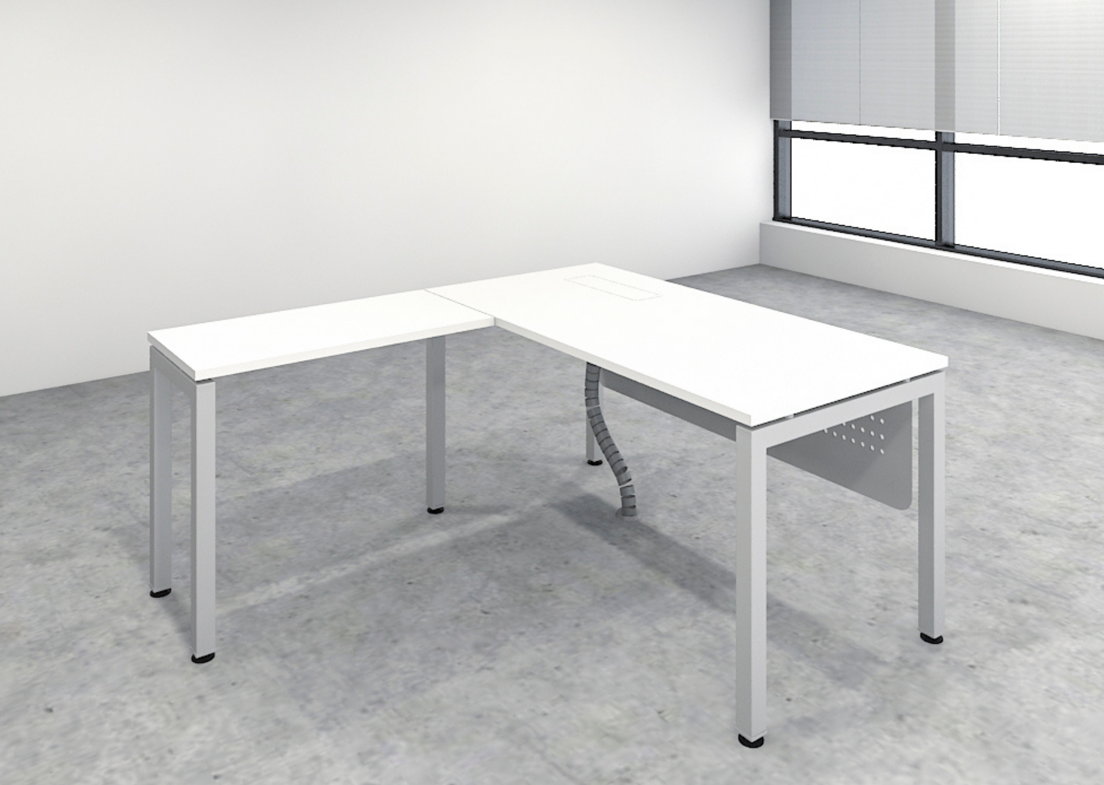 An extended workstation with an additional side return, providing extra space for documents, office essentials, or dual-monitor setups, ensuring better organization and efficiency.