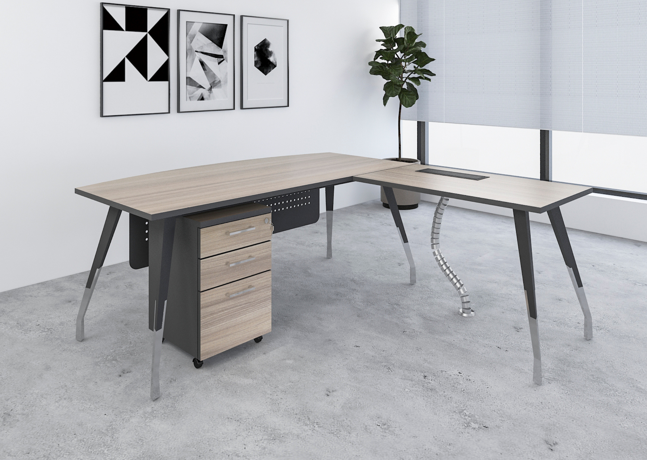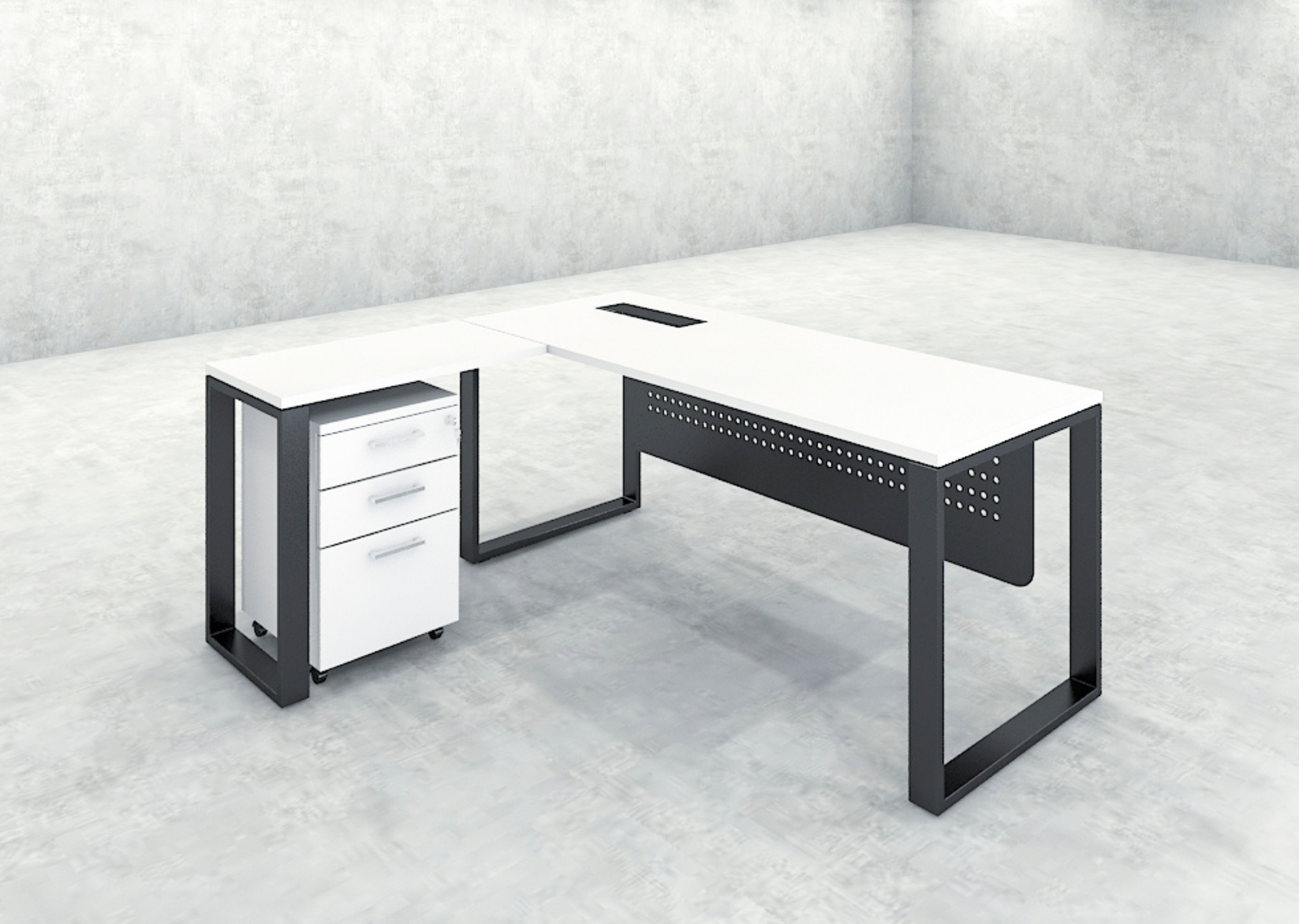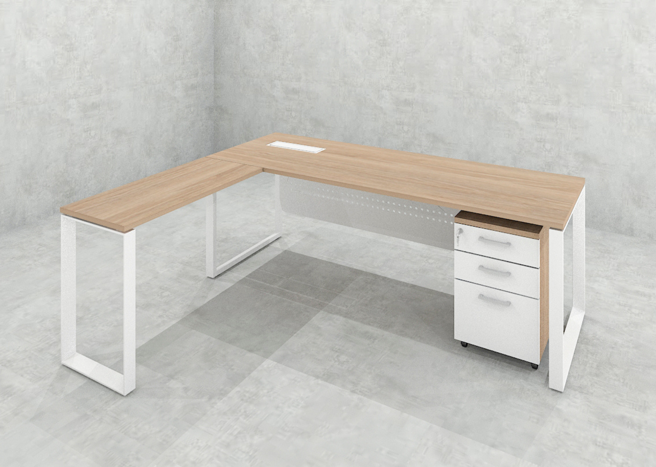 An extended workstation with an additional side return, providing extra space for documents, office essentials, or dual-monitor setups, ensuring better organization and efficiency.