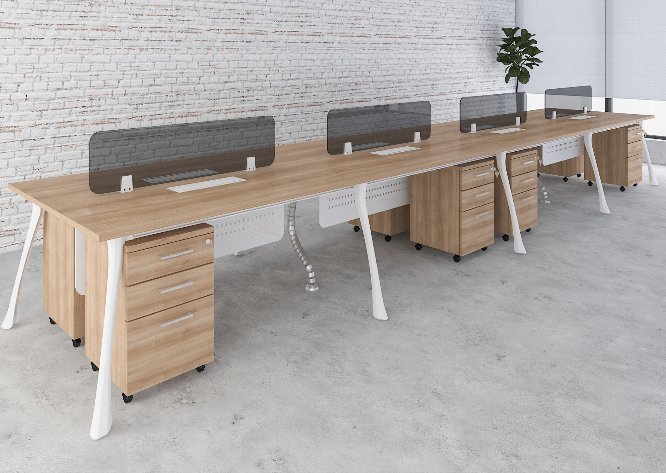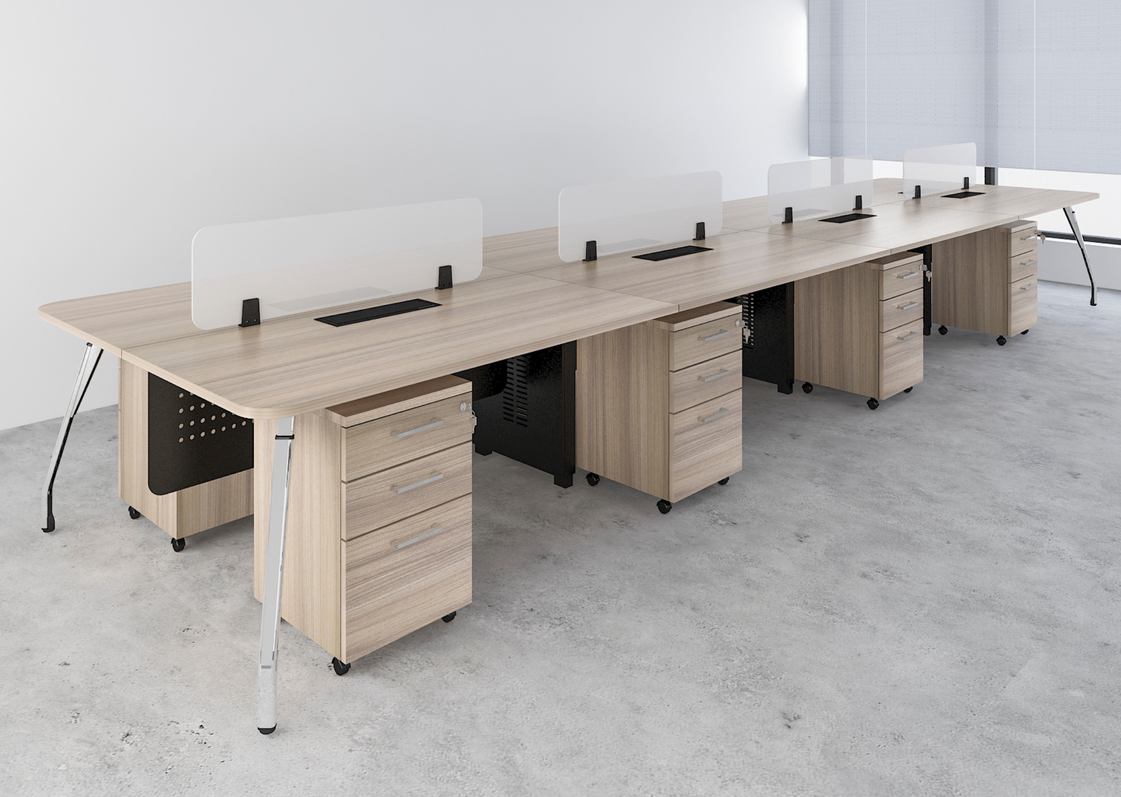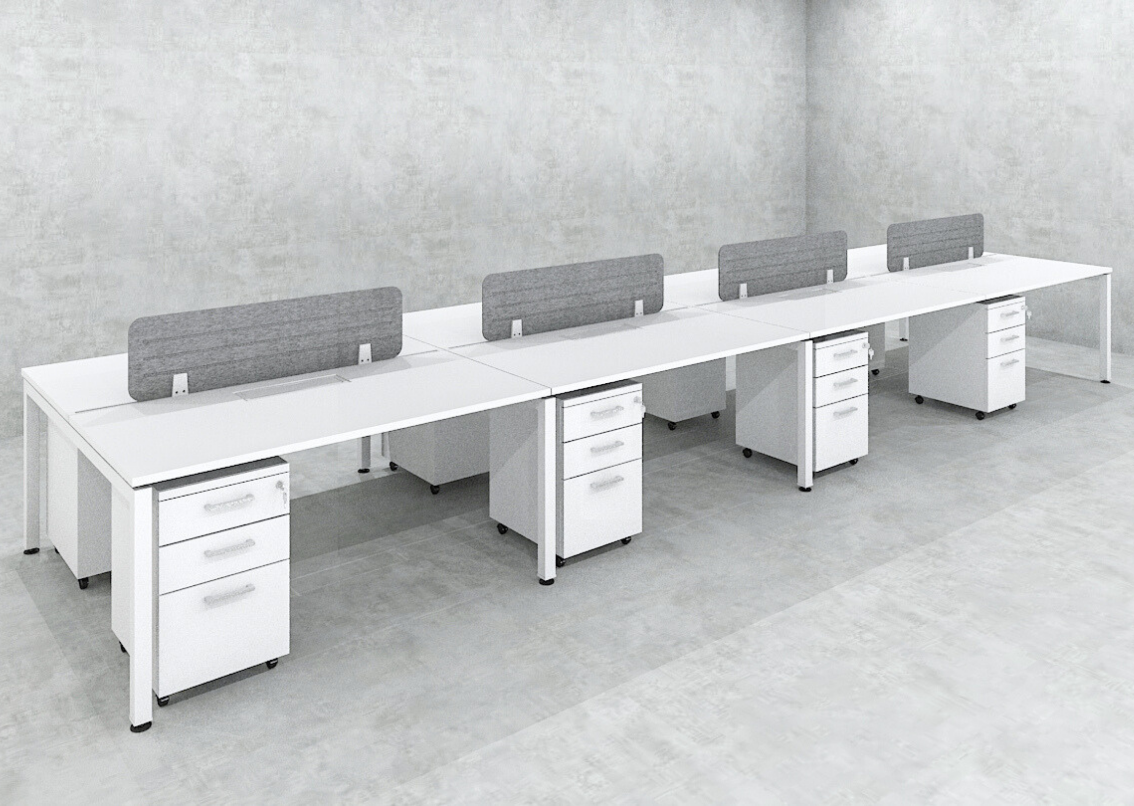 A high-capacity workstation layout designed for eight users, promoting collaboration in dynamic office environments. Offers a seamless blend of open communication and structured work areas.