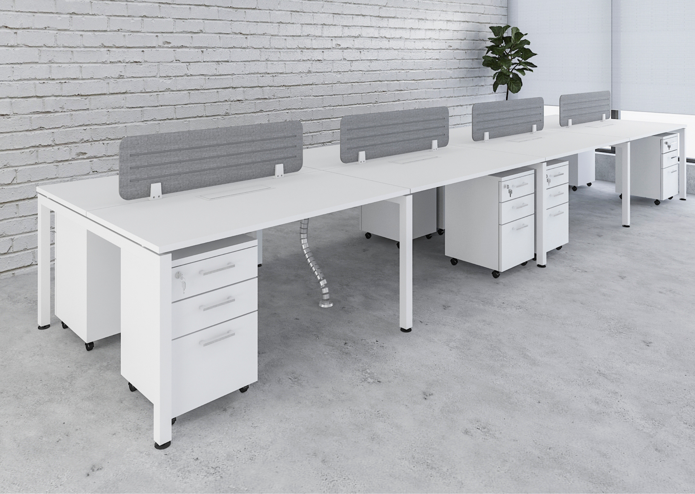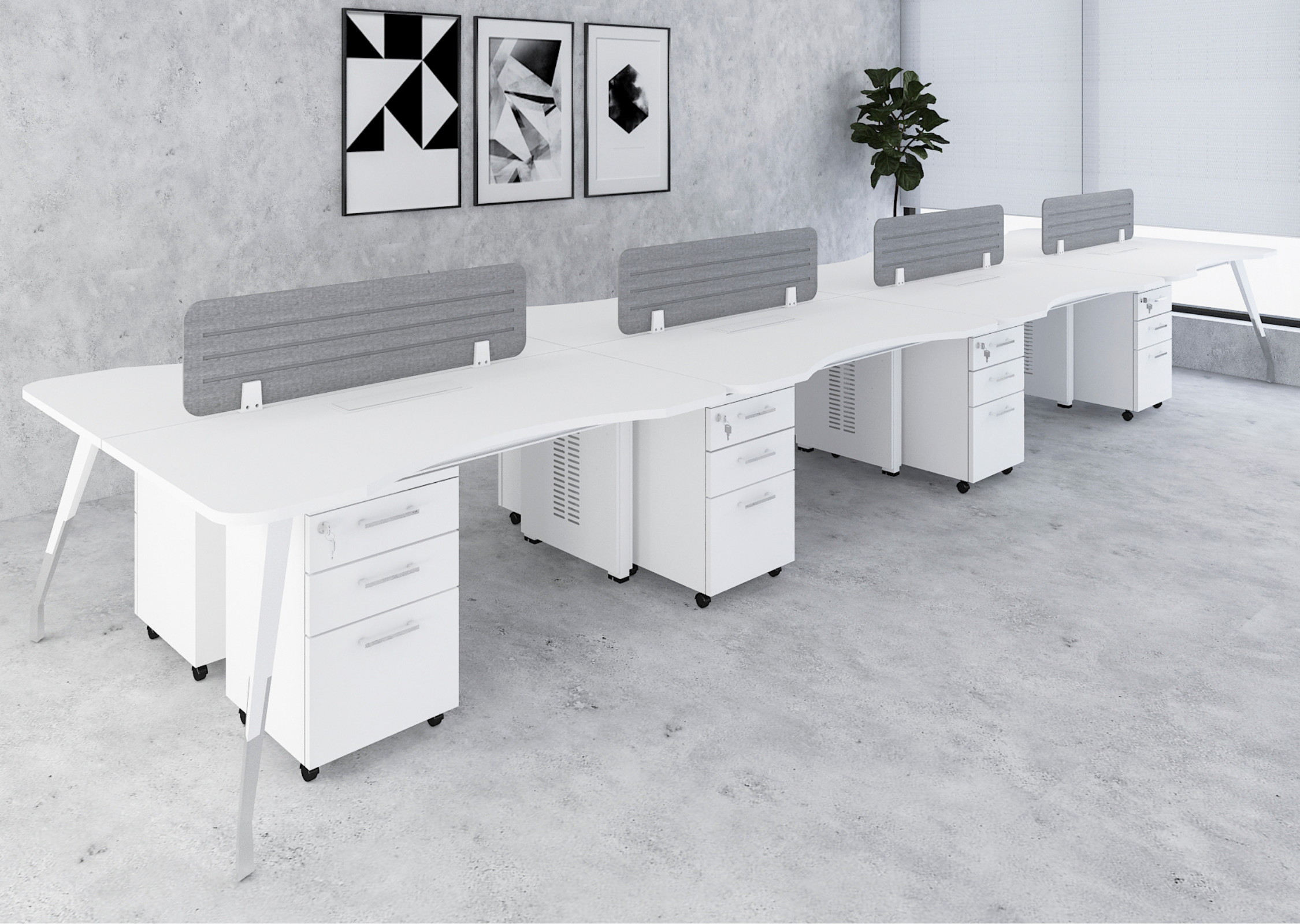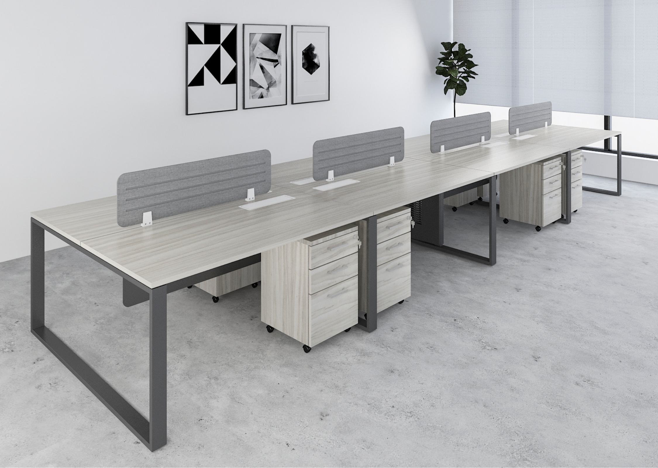 A high-capacity workstation layout designed for eight users, promoting collaboration in dynamic office environments. Offers a seamless blend of open communication and structured work areas.